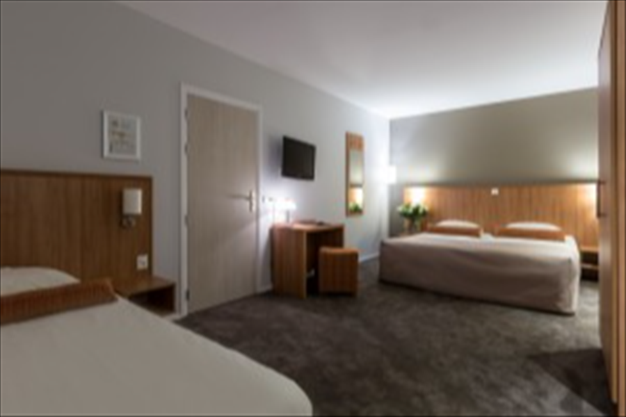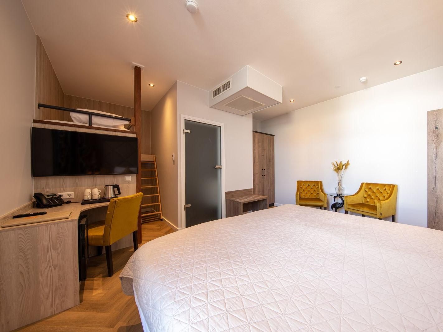 Onze comfort familiekamer is ideaal voor gezinnen en biedt een ontspannend verblijf. De kamer is uitgerust met een tweepersoonsboxspringbed (met twee losse matrassen) en een comfortabel stapelbed voor de kinderen. Geniet van de luxe van boxspringbedden, een moderne klimaatbeheersing en een flatscreen TV van 32 inch. De kamer beschikt verder over een minibar, telefoon, en gratis snelle wifi.