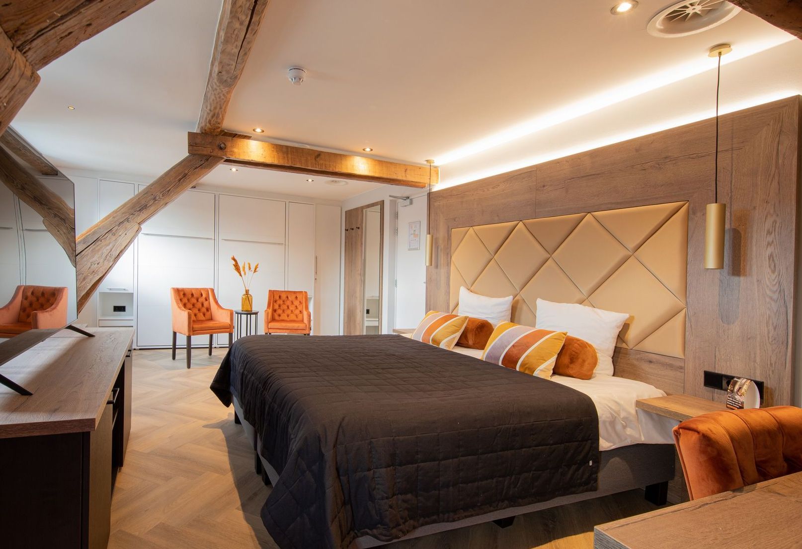 Verblijf in onze royale kamer op de 1e of 2e verdieping, uitgerust met klimaatbeheersing en een luxueus kingsize bed voor ultiem comfort. Geniet van een groot 2-persoons spabad en een verfrissende rainshower. Ontspan in het sfeervolle zitje en kijk je favoriete shows op de 55-inch tv, inclusief Netflix. Een babybed is beschikbaar voor slechts €15 per nacht en ook je huisdier is welkom voor €15 per nacht."